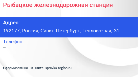 Рыбацкое, железнодорожная станция по адресу 192177, Россия, Санкт-Петербург, Тепловозная, 31 в дальнейшем Организация, размещена в следующих категориях: