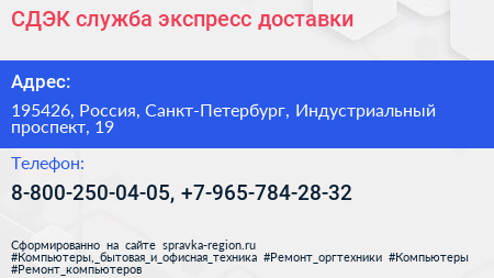 СДЭК, служба экспресс-доставки по адресу 195426, Россия, Санкт-Петербург, Индустриальный проспект, 19 в дальнейшем Организация, размещена в следующих категориях:
