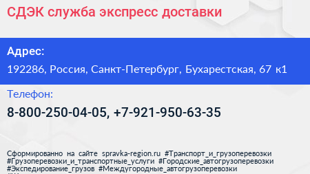 СДЭК, служба экспресс-доставки по адресу 192286, Россия, Санкт-Петербург, Бухарестская, 67 к1 в дальнейшем Организация, размещена в следующих категориях: