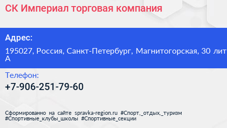 СК Империал, торговая компания по адресу 195027, Россия, Санкт-Петербург, Магнитогорская, 30 лит А в дальнейшем Организация, размещена в следующих категориях:
