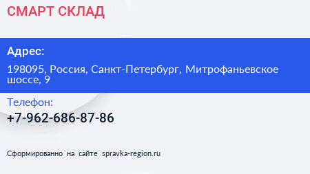 СМАРТ-СКЛАД по адресу 198095, Россия, Санкт-Петербург, Митрофаньевское шоссе, 9 в дальнейшем Организация, размещена в следующих категориях: