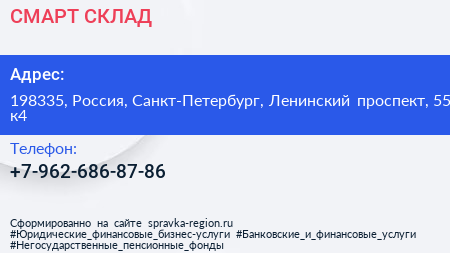 СМАРТ-СКЛАД по адресу 198335, Россия, Санкт-Петербург, Ленинский проспект, 55 к4 в дальнейшем Организация, размещена в следующих категориях: