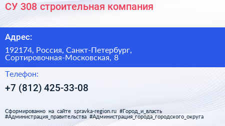 СУ №308, строительная компания по адресу 192174, Россия, Санкт-Петербург, Сортировочная-Московская, 8 в дальнейшем Организация, размещена в следующих категориях: