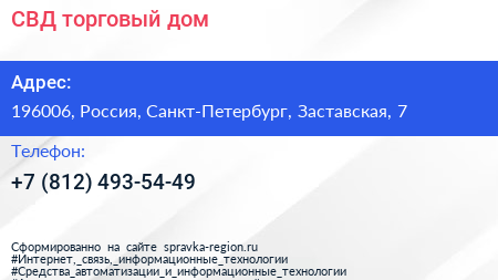 СВД, торговый дом по адресу 196006, Россия, Санкт-Петербург, Заставская, 7 в дальнейшем Организация, размещена в следующих категориях: