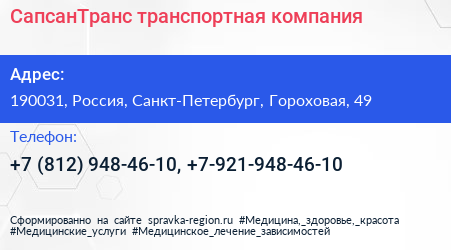 СапсанТранс, транспортная компания по адресу 190031, Россия, Санкт-Петербург, Гороховая, 49 в дальнейшем Организация, размещена в следующих категориях: