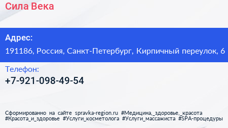 Сила Века по адресу 191186, Россия, Санкт-Петербург, Кирпичный переулок, 6 в дальнейшем Организация, размещена в следующих категориях: