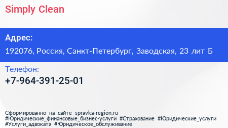 Simply Clean по адресу 192076, Россия, Санкт-Петербург, Заводская, 23 лит Б в дальнейшем Организация, размещена в следующих категориях: