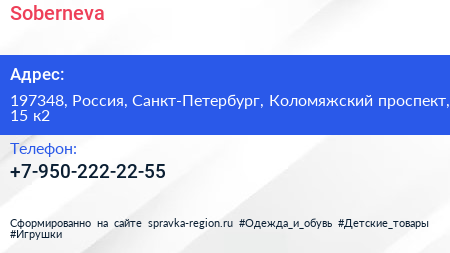 Soberneva по адресу 197348, Россия, Санкт-Петербург, Коломяжский проспект, 15 к2 в дальнейшем Организация, размещена в следующих категориях: