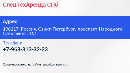 СпецТехАренда СПб по адресу 198217, Россия, Санкт-Петербург, проспект Народного Ополчения, 151 в дальнейшем Организация, размещена в следующих категориях: