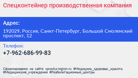 Спецконтейнер, производственная компания по адресу 192029, Россия, Санкт-Петербург, Большой Смоленский проспект, 12 в дальнейшем Организация, размещена в следующих категориях: