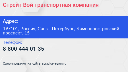 Стрейт Вэй, транспортная компания по адресу 197101, Россия, Санкт-Петербург, Каменноостровский проспект, 15 в дальнейшем Организация, размещена в следующих категориях: