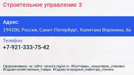 Строительное управление №3 по адресу 194100, Россия, Санкт-Петербург, Капитана Воронина, 8а в дальнейшем Организация, размещена в следующих категориях:
