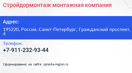 Стройдормонтаж, монтажная компания по адресу 195220, Россия, Санкт-Петербург, Гражданский проспект, 4 в дальнейшем Организация, размещена в следующих категориях: