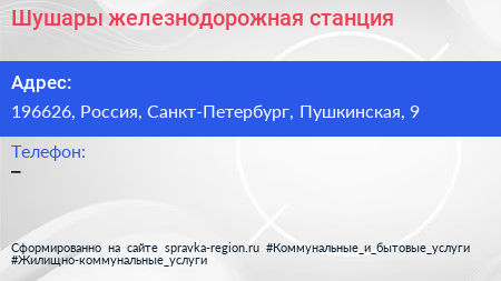 Шушары, железнодорожная станция по адресу 196626, Россия, Санкт-Петербург, Пушкинская, 9 в дальнейшем Организация, размещена в следующих категориях: