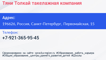 Тяни-Толкай, такелажная компания по адресу 196626, Россия, Санкт-Петербург, Первомайская, 15 в дальнейшем Организация, размещена в следующих категориях: