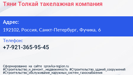Тяни-Толкай, такелажная компания по адресу 192102, Россия, Санкт-Петербург, Фучика, 6 в дальнейшем Организация, размещена в следующих категориях: