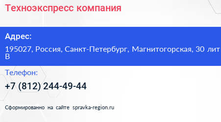 Техноэкспресс, компания по адресу 195027, Россия, Санкт-Петербург, Магнитогорская, 30 лит В в дальнейшем Организация, размещена в следующих категориях: