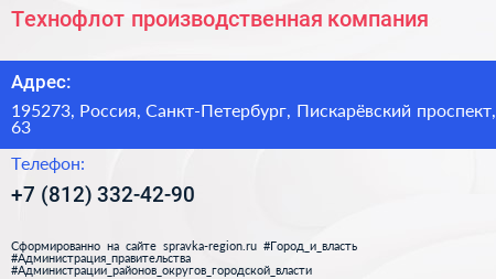 Технофлот, производственная компания по адресу 195273, Россия, Санкт-Петербург, Пискарёвский проспект, 63 в дальнейшем Организация, размещена в следующих категориях: