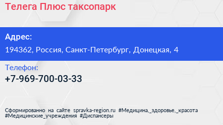 Телега Плюс, таксопарк по адресу 194362, Россия, Санкт-Петербург, Донецкая, 4 в дальнейшем Организация, размещена в следующих категориях: