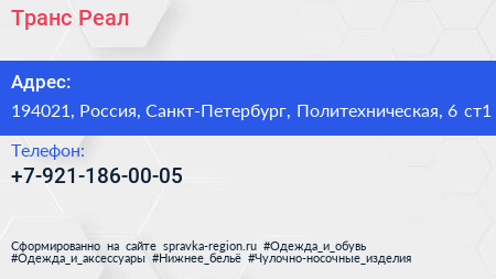 Транс Реал по адресу 194021, Россия, Санкт-Петербург, Политехническая, 6 ст1 в дальнейшем Организация, размещена в следующих категориях: