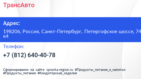 ТрансАвто по адресу 198206, Россия, Санкт-Петербург, Петергофское шоссе, 74 к4 в дальнейшем Организация, размещена в следующих категориях:
