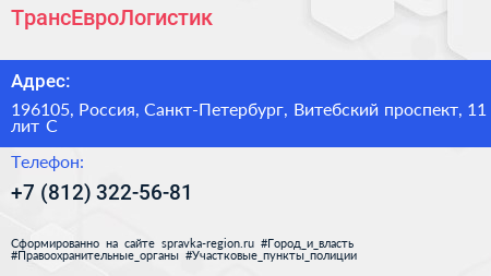 ТрансЕвроЛогистик по адресу 196105, Россия, Санкт-Петербург, Витебский проспект, 11 лит С в дальнейшем Организация, размещена в следующих категориях:
