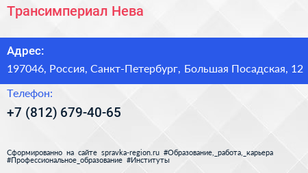 Трансимпериал Нева по адресу 197046, Россия, Санкт-Петербург, Большая Посадская, 12 в дальнейшем Организация, размещена в следующих категориях: