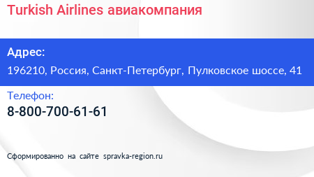 Turkish Airlines, авиакомпания по адресу 196210, Россия, Санкт-Петербург, Пулковское шоссе, 41 в дальнейшем Организация, размещена в следующих категориях: