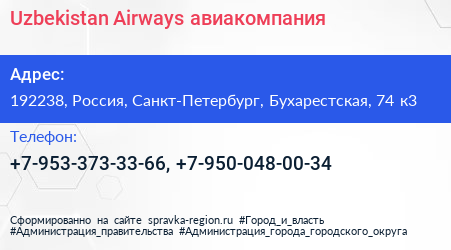 Uzbekistan Airways, авиакомпания по адресу 192238, Россия, Санкт-Петербург, Бухарестская, 74 к3 в дальнейшем Организация, размещена в следующих категориях: