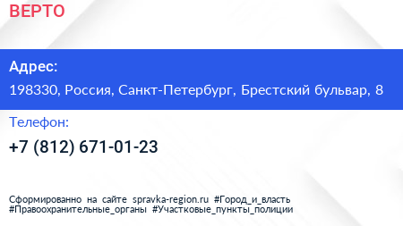 ВЕРТО по адресу 198330, Россия, Санкт-Петербург, Брестский бульвар, 8 в дальнейшем Организация, размещена в следующих категориях: