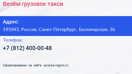 Везём!, грузовое такси по адресу 195043, Россия, Санкт-Петербург, Беломорская, 36 в дальнейшем Организация, размещена в следующих категориях: