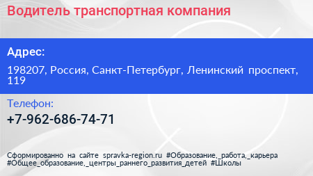 Водитель, транспортная компания по адресу 198207, Россия, Санкт-Петербург, Ленинский проспект, 119 в дальнейшем Организация, размещена в следующих категориях: