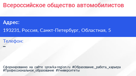Всероссийское общество автомобилистов по адресу 193231, Россия, Санкт-Петербург, Областная, 5 в дальнейшем Организация, размещена в следующих категориях: