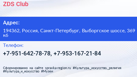 ZDS-Club по адресу 194362, Россия, Санкт-Петербург, Выборгское шоссе, 369 к6 в дальнейшем Организация, размещена в следующих категориях: