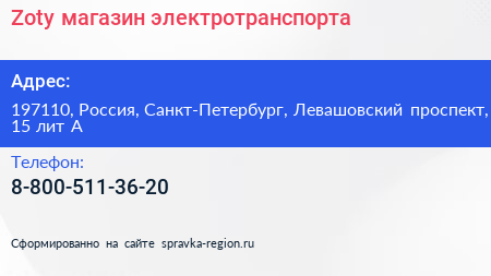 Zoty, магазин электротранспорта по адресу 197110, Россия, Санкт-Петербург, Левашовский проспект, 15 лит А в дальнейшем Организация, размещена в следующих категориях: