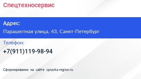 Спецтехносервис по адресу Парашютная улица, 43, Санкт-Петербург в дальнейшем Организация, размещена в следующих категориях: