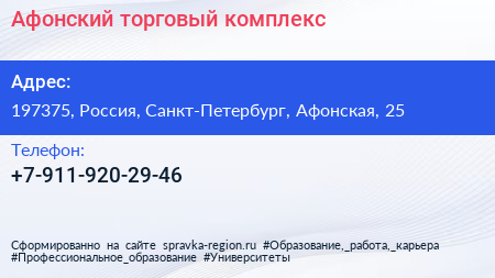 Афонский, торговый комплекс по адресу 197375, Россия, Санкт-Петербург, Афонская, 25 в дальнейшем Организация, размещена в следующих категориях: