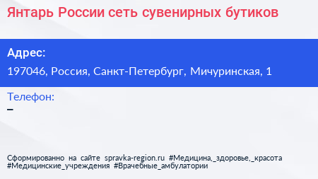 Янтарь России, сеть сувенирных бутиков по адресу 197046, Россия, Санкт-Петербург, Мичуринская, 1 в дальнейшем Организация, размещена в следующих категориях: