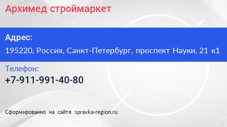 Архимед, строймаркет по адресу 195220, Россия, Санкт-Петербург, проспект Науки, 21 к1 в дальнейшем Организация, размещена в следующих категориях: