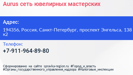 Aurus, сеть ювелирных мастерских по адресу 194356, Россия, Санкт-Петербург, проспект Энгельса, 138 к2 в дальнейшем Организация, размещена в следующих категориях: