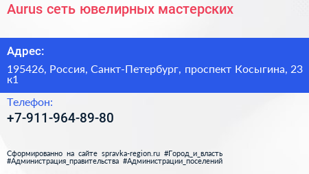 Aurus, сеть ювелирных мастерских по адресу 195426, Россия, Санкт-Петербург, проспект Косыгина, 23 к1 в дальнейшем Организация, размещена в следующих категориях:
