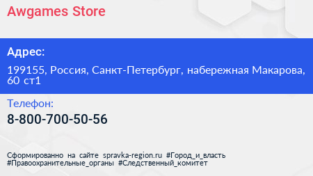Awgames.Store по адресу 199155, Россия, Санкт-Петербург, набережная Макарова, 60 ст1 в дальнейшем Организация, размещена в следующих категориях: