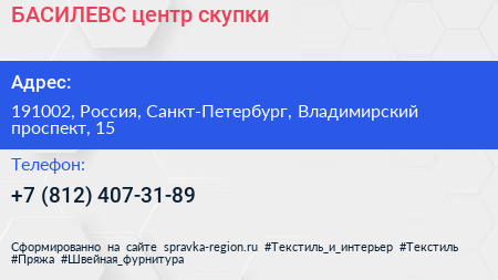 БАСИЛЕВС, центр скупки по адресу 191002, Россия, Санкт-Петербург, Владимирский проспект, 15 в дальнейшем Организация, размещена в следующих категориях: