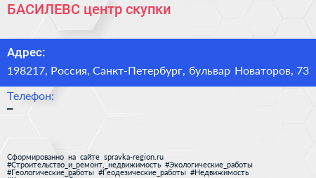 БАСИЛЕВС, центр скупки по адресу 198217, Россия, Санкт-Петербург, бульвар Новаторов, 73 в дальнейшем Организация, размещена в следующих категориях: