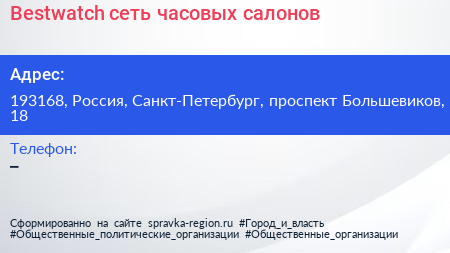 Bestwatch, сеть часовых салонов по адресу 193168, Россия, Санкт-Петербург, проспект Большевиков, 18 в дальнейшем Организация, размещена в следующих категориях: