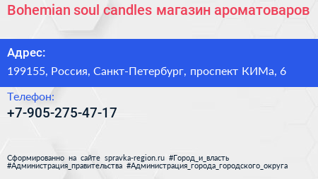 Bohemian soul candles, магазин ароматоваров по адресу 199155, Россия, Санкт-Петербург, проспект КИМа, 6 в дальнейшем Организация, размещена в следующих категориях: