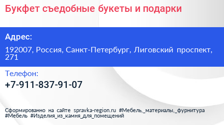 Букфет, съедобные букеты и подарки по адресу 192007, Россия, Санкт-Петербург, Лиговский проспект, 271 в дальнейшем Организация, размещена в следующих категориях: