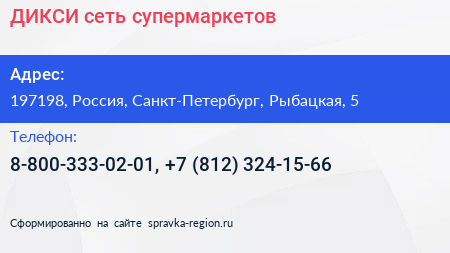 ДИКСИ, сеть супермаркетов по адресу 197198, Россия, Санкт-Петербург, Рыбацкая, 5 в дальнейшем Организация, размещена в следующих категориях:
