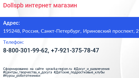 Dollspb, интернет-магазин по адресу 195248, Россия, Санкт-Петербург, Ириновский проспект, 2 в дальнейшем Организация, размещена в следующих категориях:
