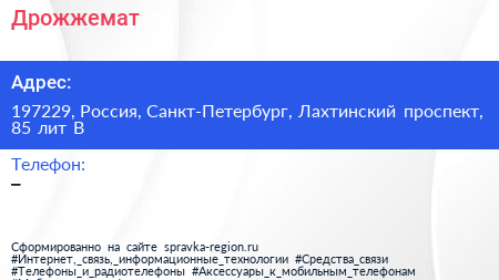 Дрожжемат по адресу 197229, Россия, Санкт-Петербург, Лахтинский проспект, 85 лит В в дальнейшем Организация, размещена в следующих категориях: